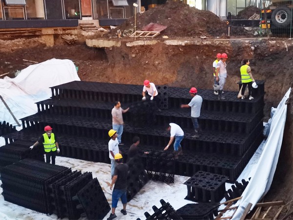 ?。ǔ鞘行钏兀?br />   即把雨水留下來,要尊重自然的地形地貌,使降雨得到自然散落?,F(xiàn)在人工建設(shè)破壞了自然地形地貌后,短時間內(nèi)水匯集到一個地方,就形成了內(nèi)澇。所以要把降雨蓄起來,以達到調(diào)蓄和錯峰。而當(dāng)下海綿城市蓄水環(huán)節(jié)沒有固定的標(biāo)準(zhǔn)和要求,地下蓄水樣式多樣,總體常用形式有兩種:塑料模塊蓄水、地下蓄水池。