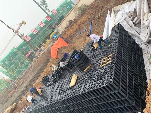 PP模塊構(gòu)筑物采用聚丙烯塑料單元模塊組合,在水池周圍包裹防滲土工布,形成地下貯水池。由于表面光滑,不滋生藻類,可使儲(chǔ)存的水體水質(zhì)保持較長(zhǎng)時(shí)間穩(wěn)定。再有模塊式的組合,可使雨水集蓄池極大的適應(yīng)場(chǎng)地的限制,組成各種形狀,同時(shí)具有安裝方便,承載力大,可拆除遷移至其他區(qū)域繼續(xù)使用等優(yōu)點(diǎn)。
